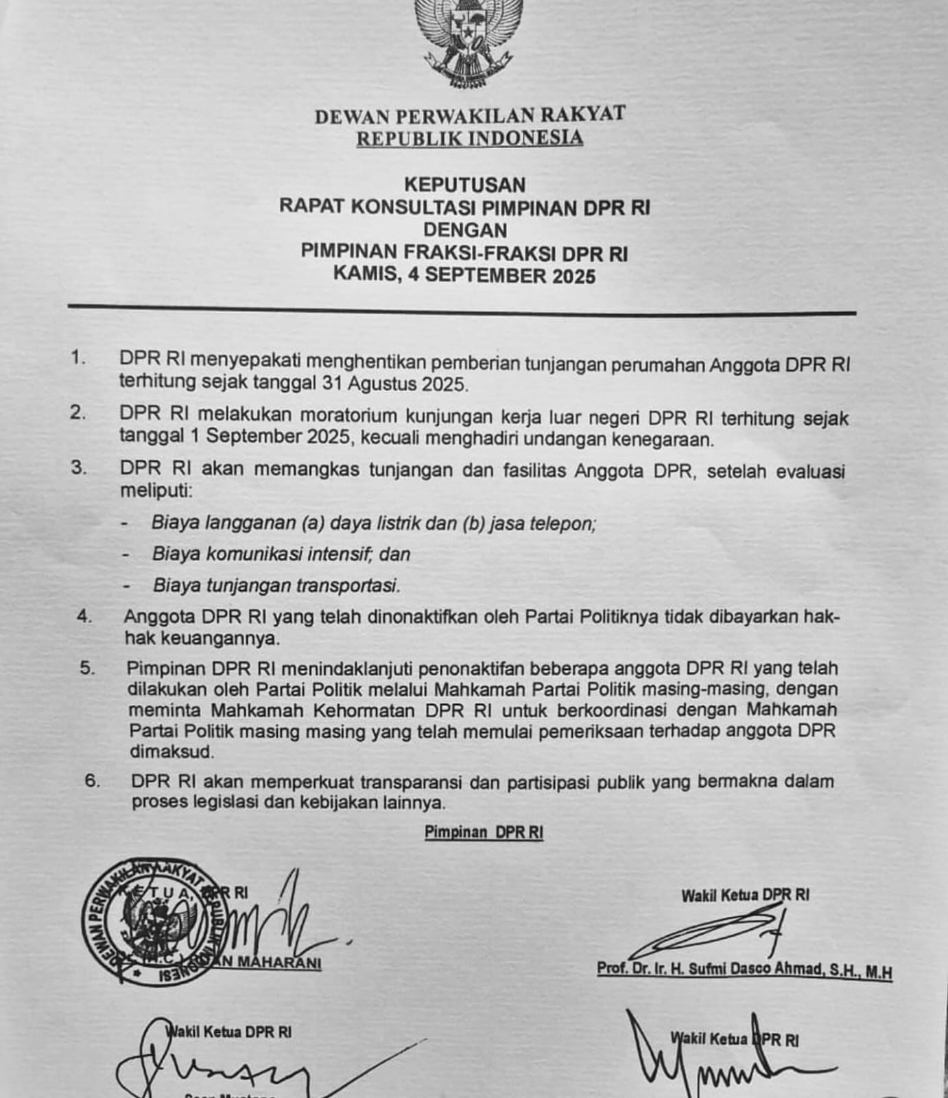 Dalam dokumen yang ditandatangani Ketua DPR Puan Maharani serta Wakil Ketua DPR Sufmi Dasco Ahmad, Saan Mustopa, dan Cucun Ahmad Syamsurijal, DPR menegaskan langkah-langkah efisiensi, pemangkasan fasilitas, hingga peningkatan transparansi lembaga.