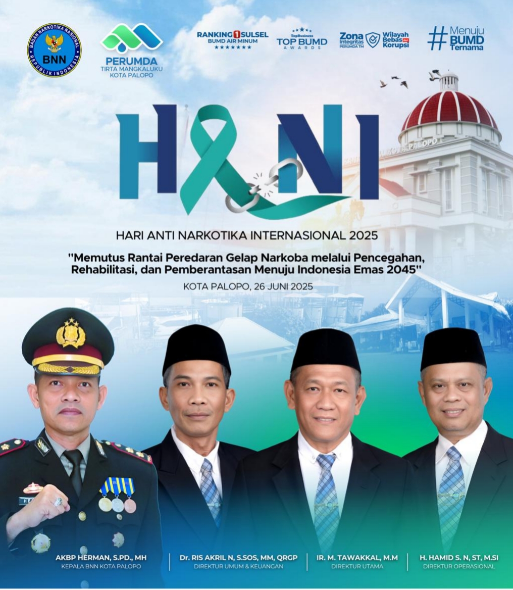Tintanarasi.com, Palopo – Perusahaan Umum Daerah (Perumda) Tirta Mangkaluku Kota Palopo bersama Badan Narkotika Nasional (BNN) Kota Palopo menyampaikan ucapan selamat memperingati Hari Anti Narkotika Internasional (HANI) 2025 yang diperingati pada Kamis (26/06/2025).