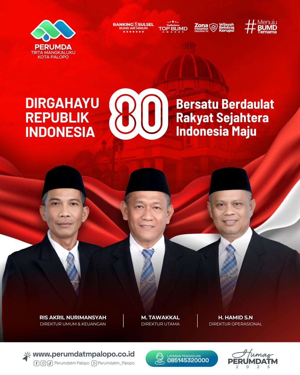 Tintanarasi.com, Palopo – Perusahaan Umum Daerah (Perumda) Tirta Mangkaluku Kota Palopo menyampaikan ucapan selamat memperingati Hari Ulang Tahun (HUT) ke-80 Republik Indonesia. Peringatan tahun ini mengusung tema nasional “Bersatu Berdaulat, Rakyat Sejahtera, Indonesia Maju.”