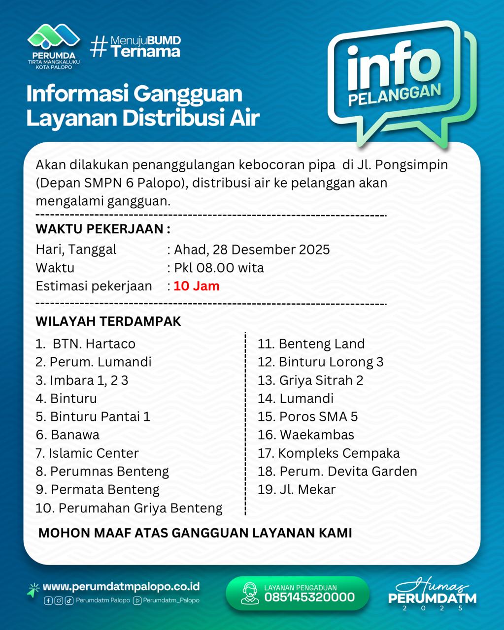 Selain informasi teknis, Perumda Tirta Mangkaluku juga mengumumkan penutupan sementara pelayanan kantor pada Kamis dan Jumat, 25-26 Desember 2025, sehubungan dengan Hari Libur Nasional dan Cuti Bersama.