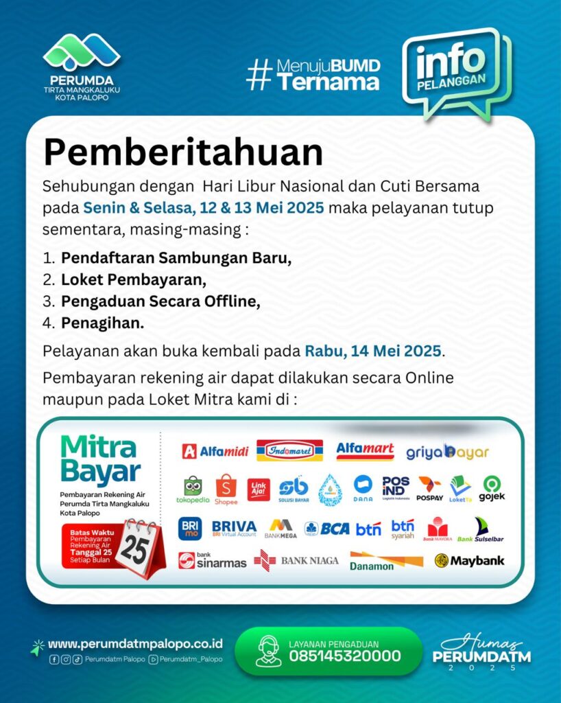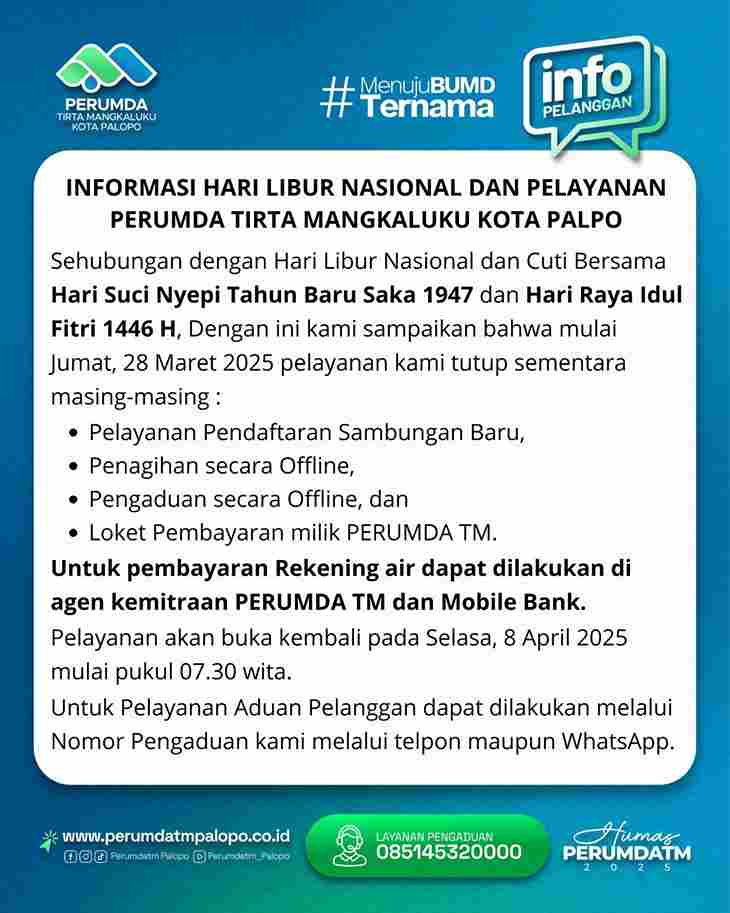 Tintanarasi.com, Palopo – Perumda Tirta Mangkaluku (TM) Kota Palopo mengumumkan penutupan sementara seluruh layanan pelanggan ...