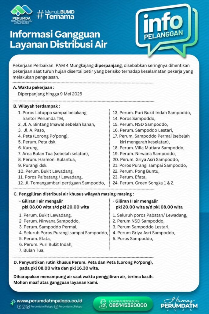 Tintanarasi.com, Palopo – Perumda Tirta Mangkaluku (TM) Kota Palopo menginformasikan akan ada gangguan aliran air ...